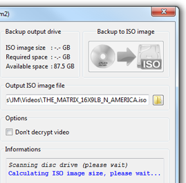 | Blu-ray disc ISO backup job performs decrypting to hard-drive (so was required space calculated) and then generates an ISO image file: |